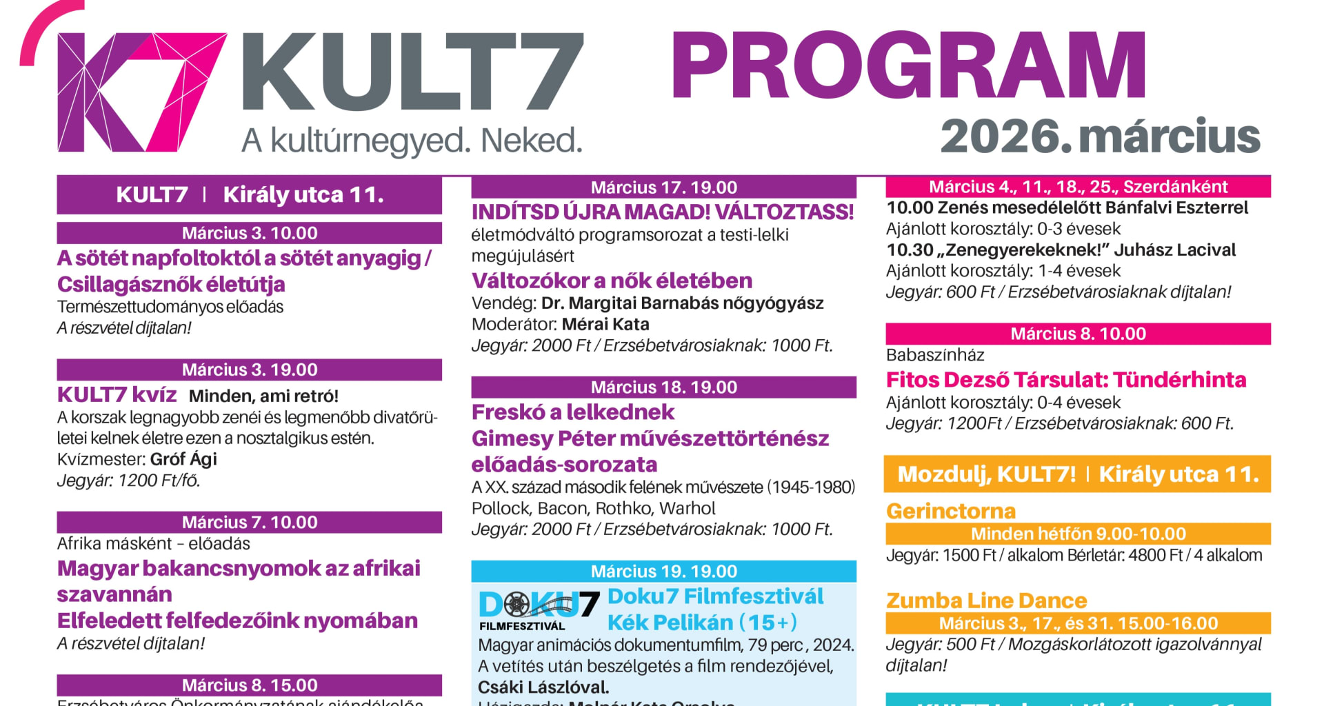 Erzsébetváros – A kultúrnegyed. Neked. A legkisebb kerületnek nagy szíve van – és ennek a nagy szívnek picinyke csücske a kultúráért dobog. A KULT7 Erzsébetváros kulturális intézménye (korábban Erőművház), amely nemcsak a kerületben lakóknak, hanem fővárosiaknak, vidéken élőknek és turistáknak is kínál száz féle kulturális programot.