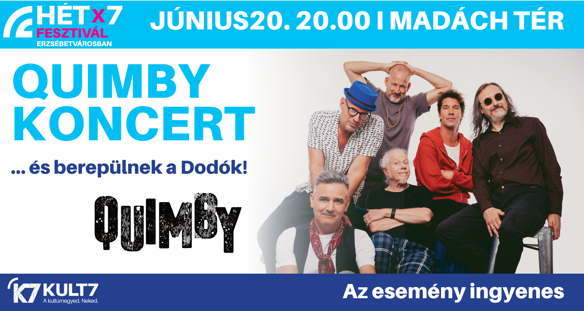 A Quimby az egyik legismertebb és legnépszerűbb magyar alternatív zenekar, amely hosszú pályafutása alatt számos sikeres albumot és dalt adott ki, rendszeresen fellép fesztiválokon és koncerteken. Ők azok, akik képesek a káoszból költészetet csinálni, és a költészetből egy kicsit káoszt, pont annyit, hogy újra és újra vissza akarj térni ebbe a furcsán ismerős, mégis megfoghatatlan világba. Június 20-án a Madách térre varázsoljuk ezt az izgalmas világot!